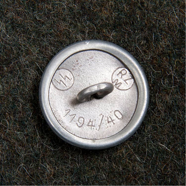 When produced in metal for cap or collar tab usage, the first type was often constructed of zinc or other alloys, while the second type came in plated metal or polished alloys. Each had prongs soldered or crimped to the reverse for mounting, while the later models often contained manufacturer codes and “Reichszeugmeisterei” (RZM – government control agency ) markings.