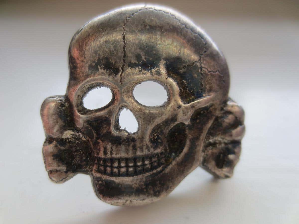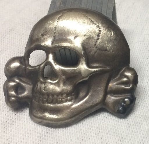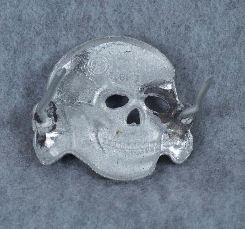 The construction of the SS death’s head transformed over time. The earliest took the form of a rounded, traditional jawless skull over short crossed bones. This was worn from 1923 until 1934. The second, a more realistic human skull complete with a jaw and short femur tips protruding from the back, as in use from 1935 to 1945.
